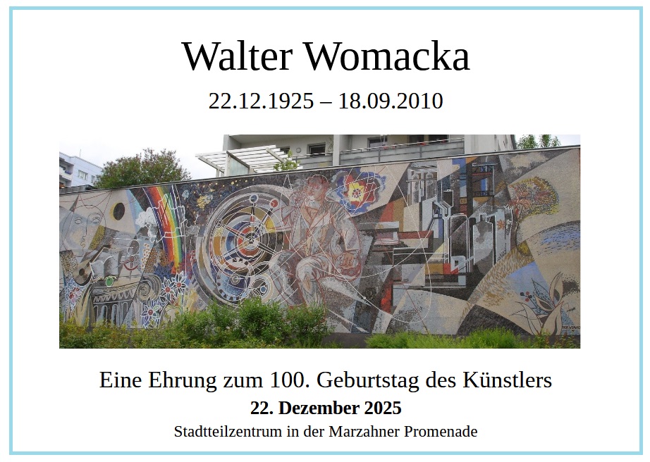 20.12.25 Im September gab es im Stadtteilzentrum verschiedene Veranstaltungen zu Ehren Walter Womackas, einem Künstler der DDR, der unter anderen auch die beiden großen Wandbilder in der Promande erschuf. Es wurde auch Geld gesammelt für je eine Ehrentafel an seinen Mosaiken.