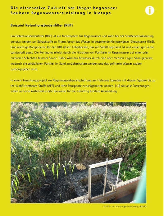 Dabei wäre das durchaus möglich, gemäß §13 Abwasserabgabengesetz (18) sind die Abgaben so zu nutzen, dass es dem Erhalt bzw. der Verbesserung der Gewässergüte dient.