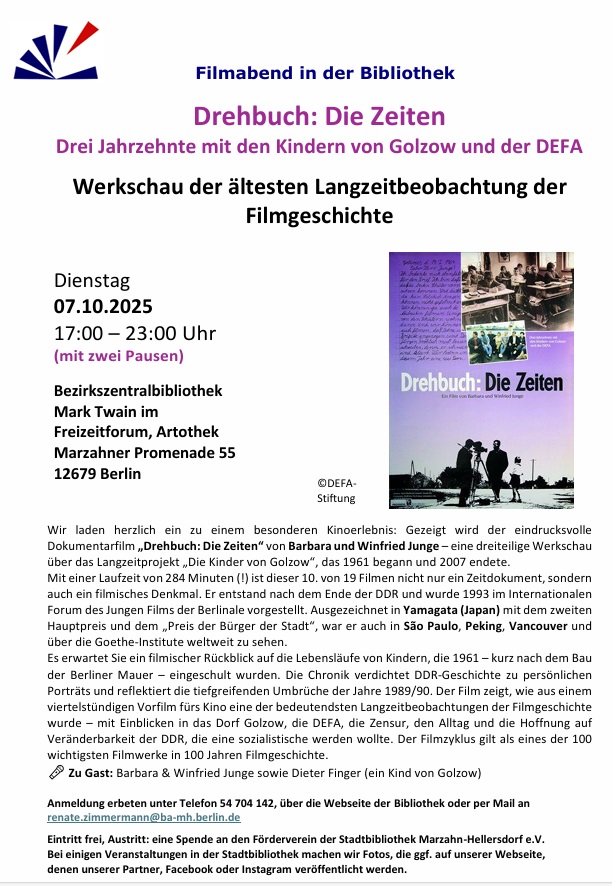 Gezeigt wird der eindrucksvolle Dokumentarfilm „Drehbuch: Die Zeiten“ von Barbara und Winfried Junge – eine dreiteilige Werkschau über das Langzeitprojekt „Die Kinder von Golzow“, das 1961 begann und 2007 endete.