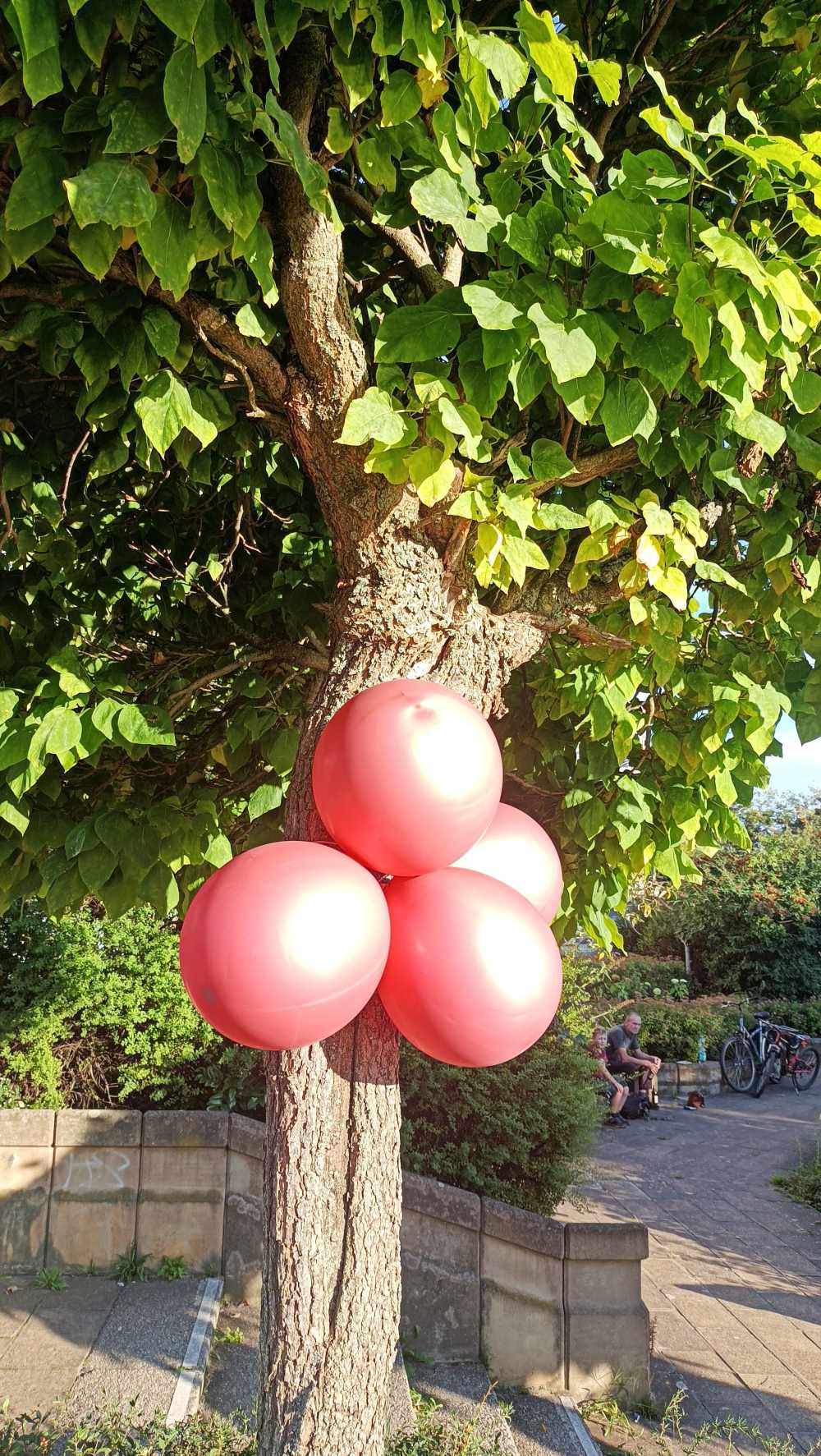 Tanzschüler dekorierten Bäume und Bänke mit roten Luftballons, farblich passend zu den roten Kordeln der Tanzflächen-Abtrennung.