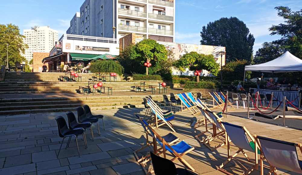 Umrahmt von der Kulisse der gepflegten Grünanlagen mit Bäumen und Gras, mit Blumen und dem Womacka-Mosaik - gleich unter der Treppe zur 5-Sterne-Bar.