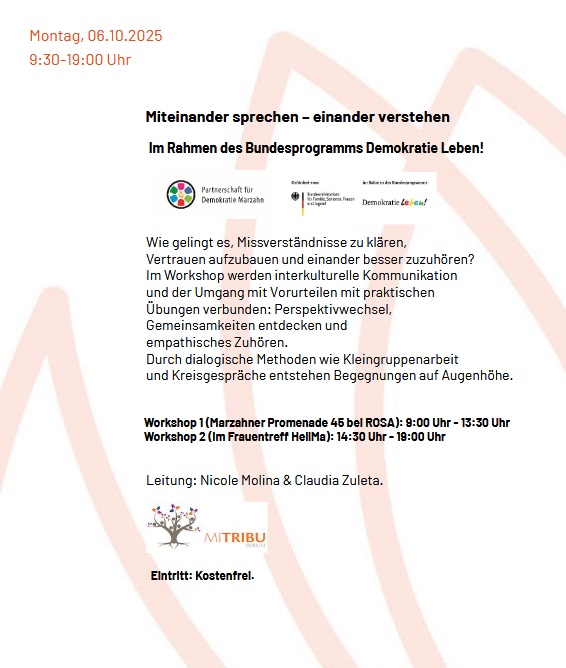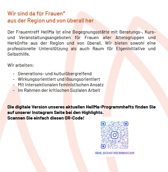 05.10.25 Wie kann es gelingen, einander besser zuzuhören, Missverständnisse zu klären und mehr Vertrauen im Miteinander aufzubauen? Am 6. Oktober gibt es dazu einen Workshop im Frauentreff Hellma, worin es darum geht, die Kommunikation im kulturübergreifenden Miteinander zu stärken. Das ganze Hellma-Oktober-Programm: