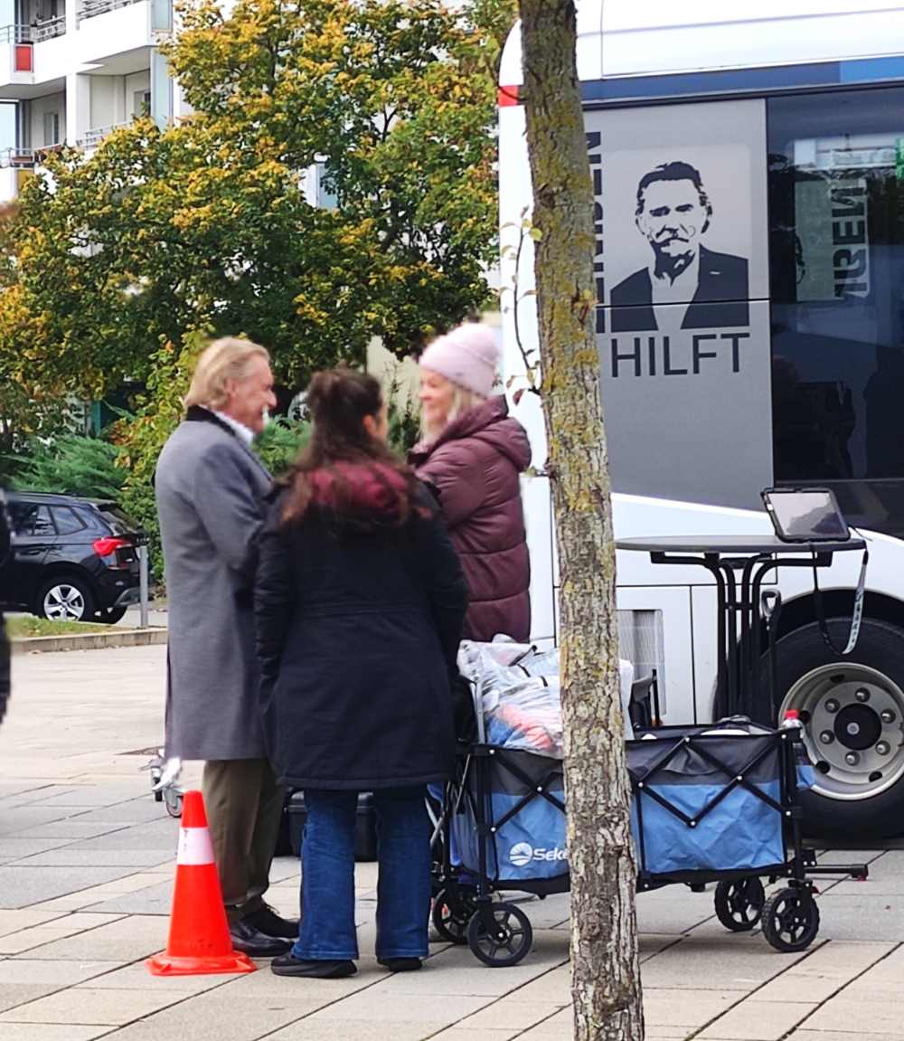 13.10.25 Wieder einmal dreht das Team von Ingo Lenßen auf der Marzahner Promenade. Weit erkennbar der weiße Kleinbus neben dem Eiscafé "La Gondola". In den Drehpausen nimmt sich der bekannte Fernsehanwalt auch Zeit für Selfies und kleine Gespräche mit den Anwohnern. Fotos: Yvonne Grüneberg