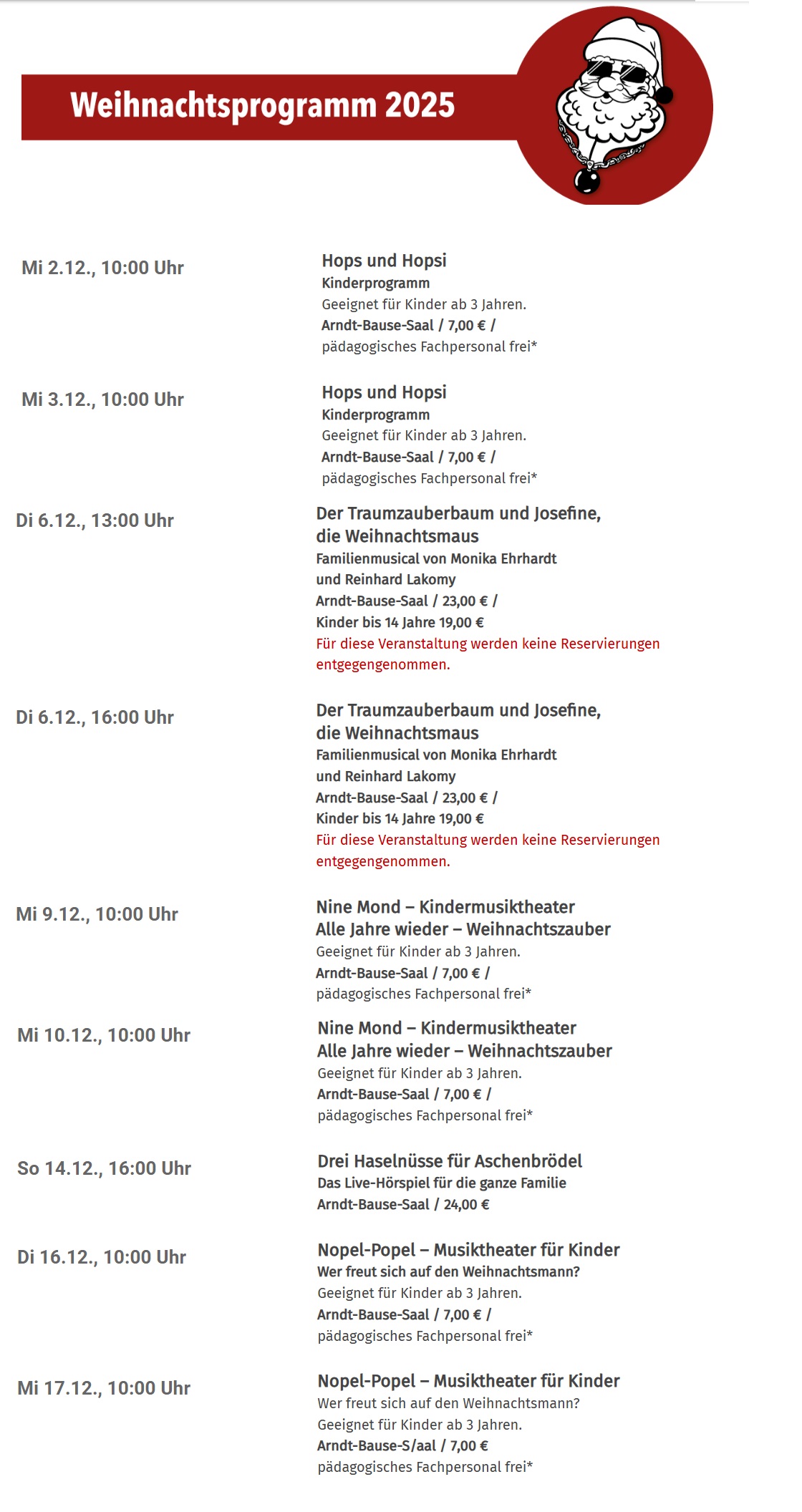 27.10.25 Bis der Weihnachtsmann kommt, können Kinder noch viel erleben. Das Freizeitforum bietet dafür viele Veranstaltungen für Kinder und Familien an. Es wird unterhaltsam, lustig, lehrreich und auch was zum Mitmachen.