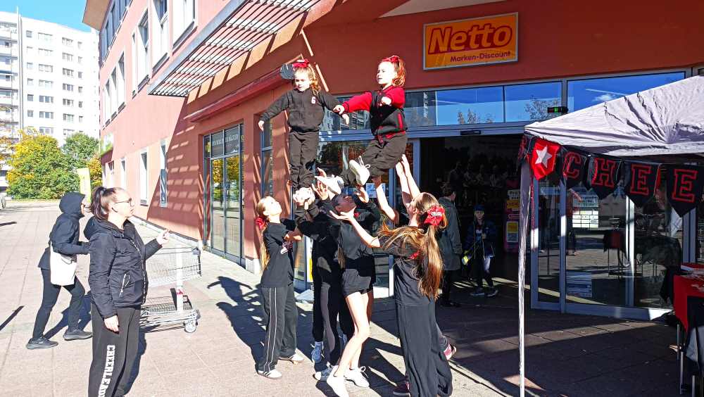 Heute wird Cheerleading überwiegend als selbstständiger Wettkampfsport betrieben. Wie das in etwa aussehen kann, zeigten Cheerleader-Mädchen am 18. Oktober vor dem Netto-Supermarkt auf dem Marktplatz der Promenade.