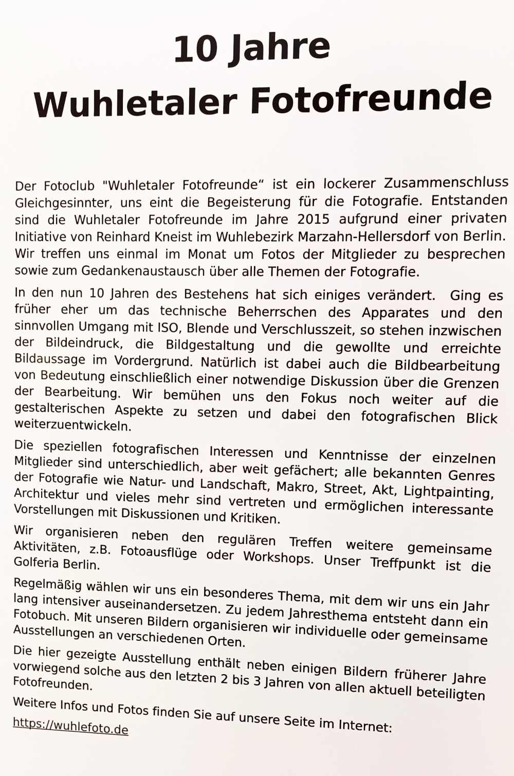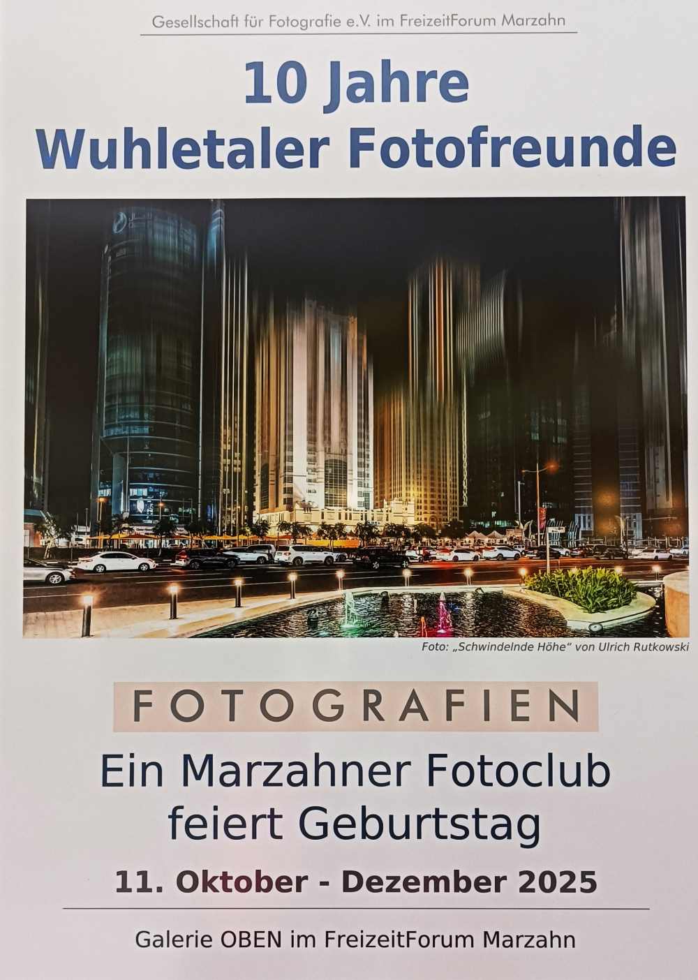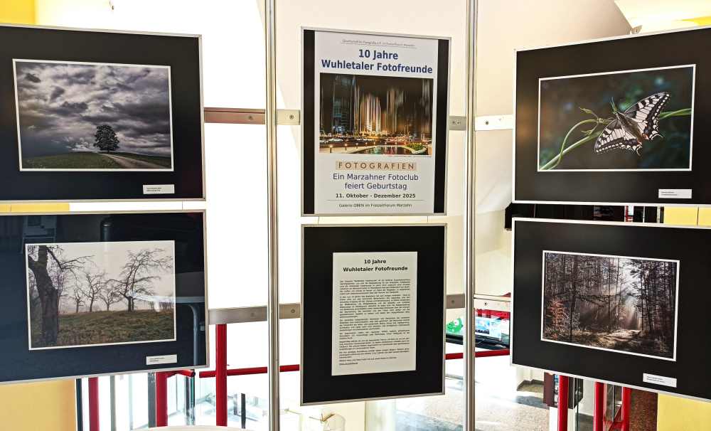 02.11.25 Die Gesellschaft für Fotografie e.V. meldet sich mit einer neuen Ausstellung im oberen Foyer im Freizeitforum zurück. Die "Wuhletaler Fotofreunde" feiern damit öffentlich ihren 10jährigen Geburtstag. Glückwunsch - es sind ansehenswerte Fotos.