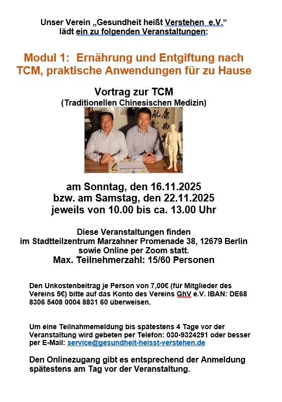 06.11.25 Für Gesundheitsbewusste gibt es im November wieder spannende Vorträge über die vielfältigen Möglichkeiten der Traditionellen Chinesischen Medizin. Dazu lädt der Verein "Gesundheit heißt Verstehen e.V." ins Stadtteilzentrum, MP 38, ein.