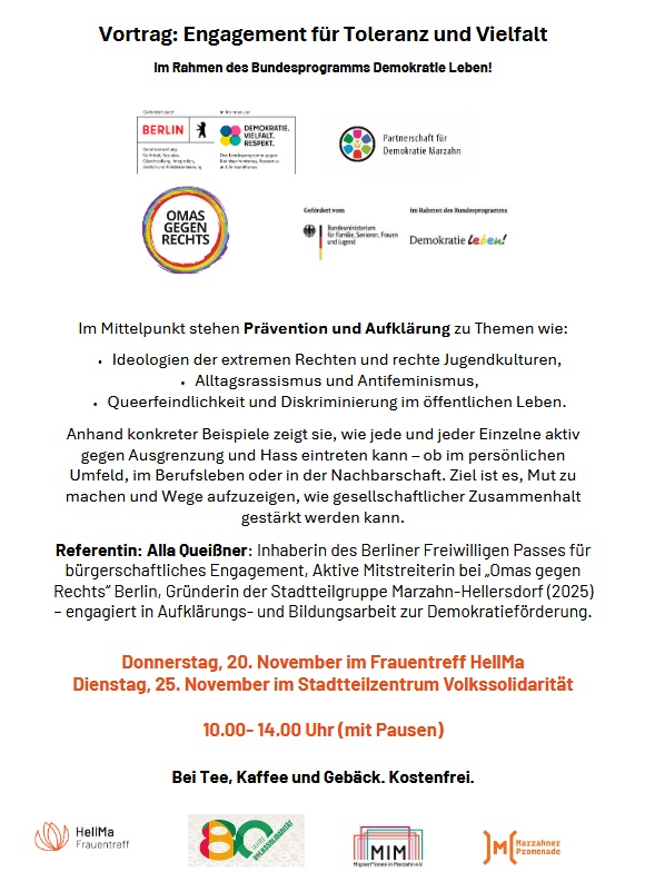 17.11.25 Im Rahmen des Bundesprogramms „Demokratie Leben!“ findet im Frauentreff HellMa sowie im Stadtteilzentrum ein Vortrag zum Thema „Engagement für Toleranz und Vielfalt“ statt. Referentin ist Alla Queißner.