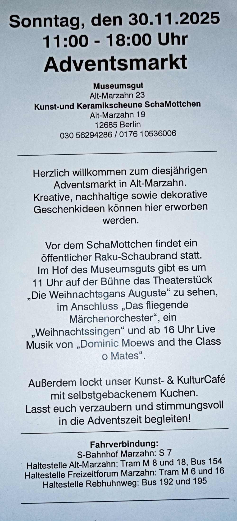 28.11.25 Die Vorbereitung laufen schon lange in den Höfen und Kultureinrichtungen in Alt Marzahn. Am Sonntag ist im Angerdorf von 11 bis 18 Uhr Adventsmarkt. SchaMottchen und Trödelscheune sind natürlich auch geöffnet.