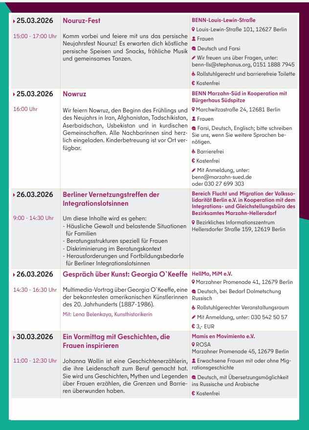 Zusätzlich thematisiert der Aktionsmonat spezifische Lebensrealitäten durch Beratungen der Polizei Berlin zu häuslicher Gewalt oder Infos der Suchtberatung. Kulturelle Beiträge würdigen Persönlichkeiten wie die Komponistin Clara Schumann oder die Tänzerin Isadora Duncan. Interkulturelle Feste zum Nouruz-Neujahr fördern den Austausch in der Nachbarschaft. Praktische Kurse wie Fahrrad-Trainings und Wendo-Workshops zur Selbstbehauptung stärken die Autonomie von Frauen und Mädchen.