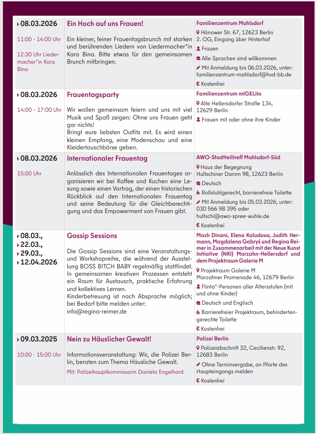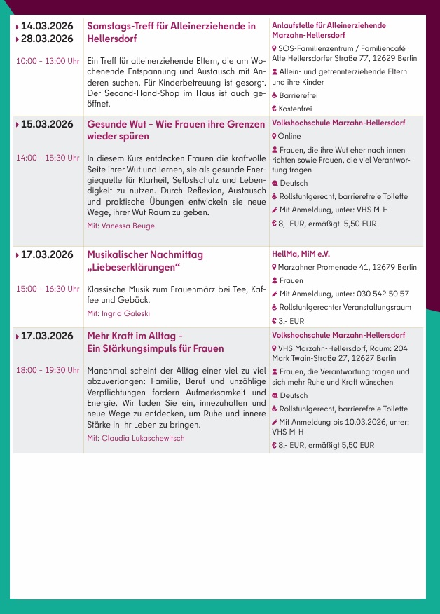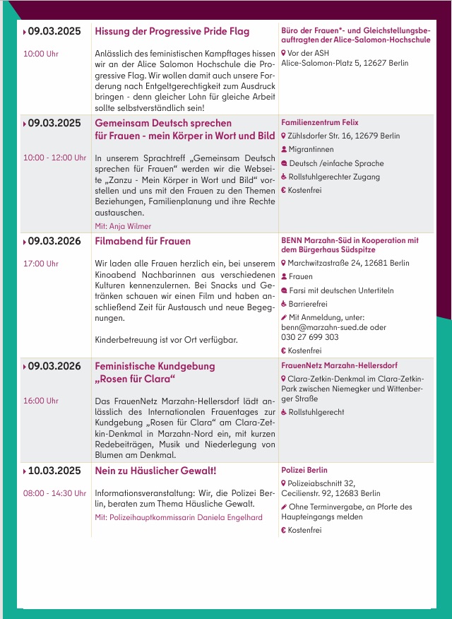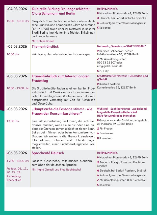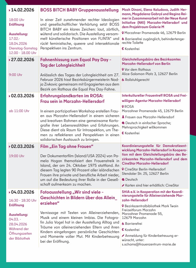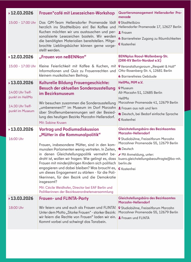 Am 2. März 2026 zeigt das Bezirksamt in Kooperation mit der Koordinierungsstelle für Demokratieentwicklung den Film „Ein Tag ohne Frauen“ im CineStar Hellersdorf. Eine Fachveranstaltung zum Thema „Mütter in die Kommunalpolitik“ findet am 13. März in der Studiobühne des Freizeitforums Marzahn statt, gefolgt von einer Party für FLINTA* (Frauen, Lesben, inter*, nicht-binäre, trans* und agender Personen). Am 23. März lädt das Bezirksamt zudem zum Stadtspaziergang „Frauen in Marzahn“ ein.
