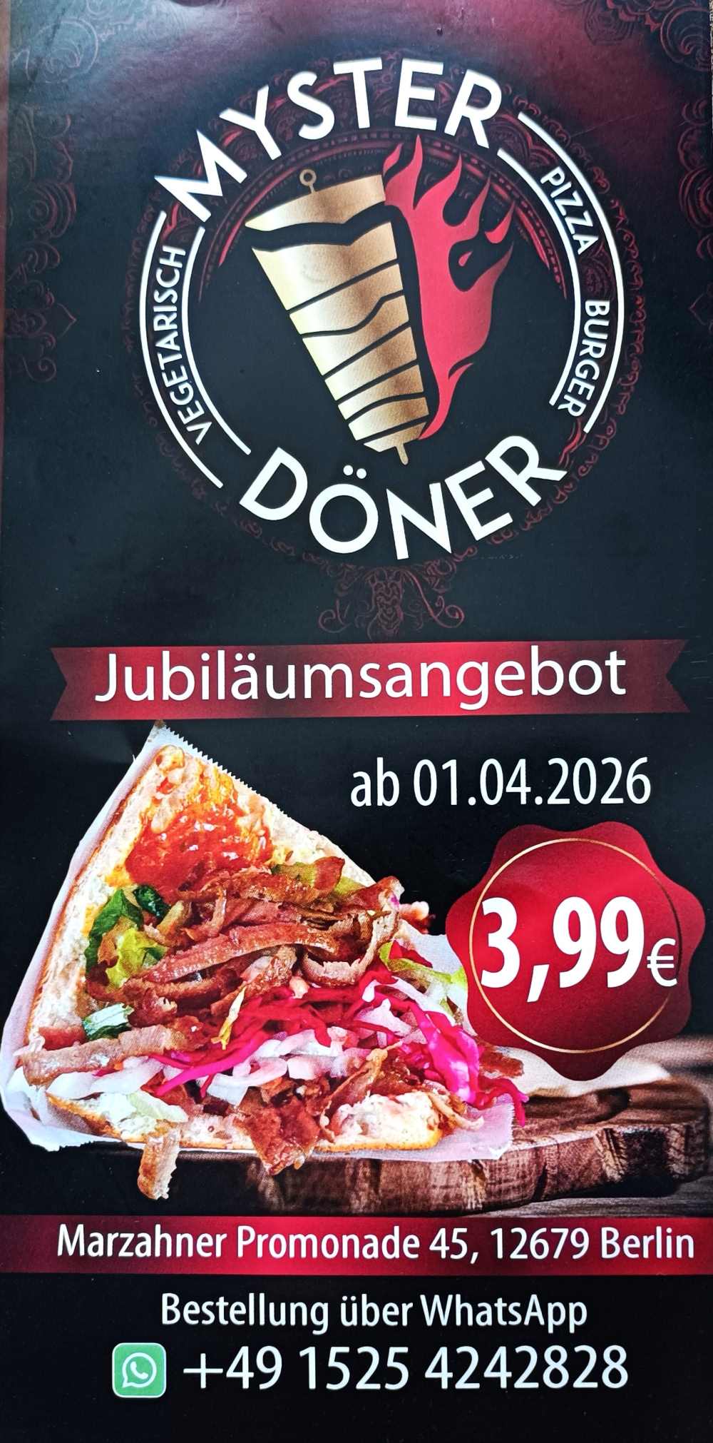 27.03.26 Nein, kein Aprilscherz, obwohl das Jubiläumangebot Döner für 3,99 Euro an genau diesem Scherztag beginnt. Der Inhaber von "Myster Döner" versichert sogar, das bleibt auch eine ganze Weile so, mindesten ein halbes Jahr.