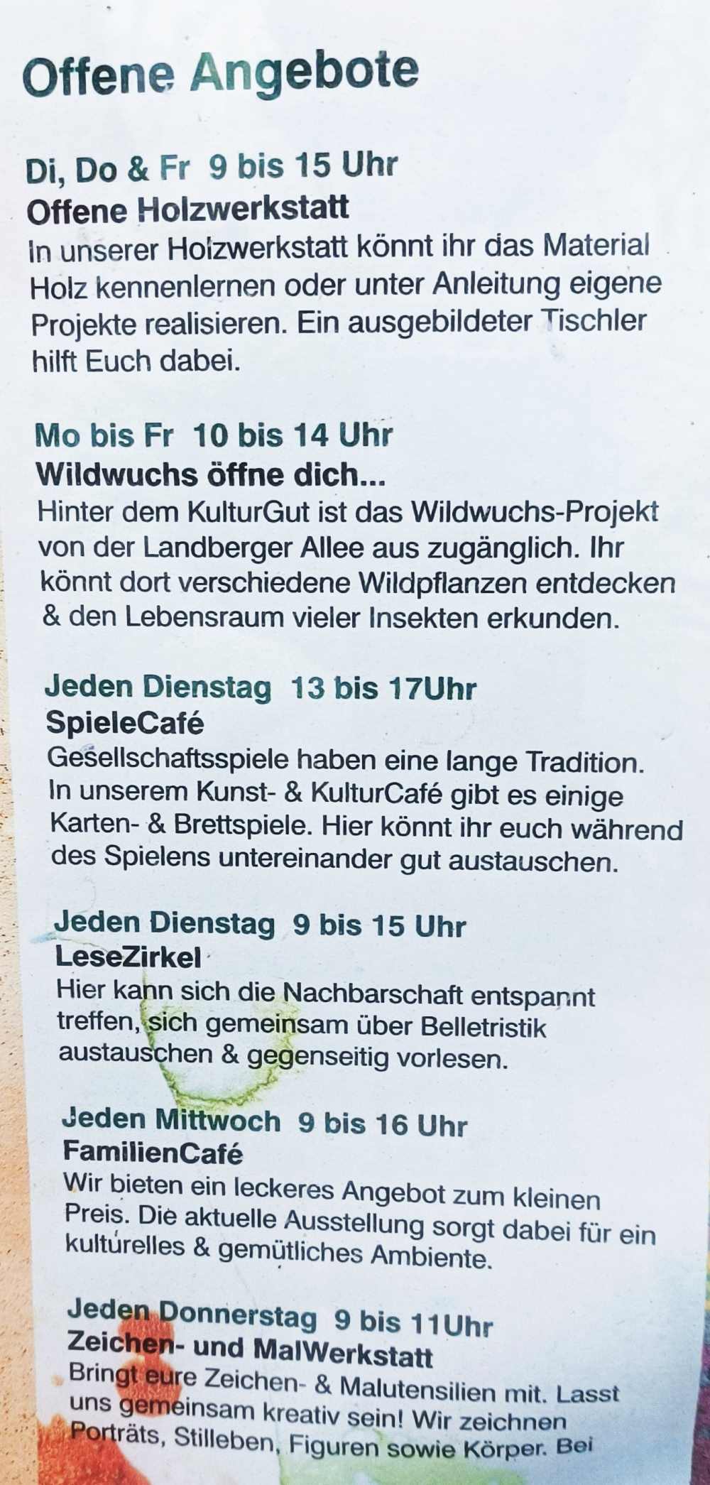 Auf dem Markt können Besucher ausgefallene und handgemachte Geschenkideen von lokalen Kunsthandwerker:innen erwerben. Kaffee, Kuchen und musikalische Untermalung sorgen für einen gemütlichen Marktbesuch. Dazu können Familien gemeinsam töpfern oder bei Holzbastelarbeiten kreativ werden. Anschließend können Familien die tierischen Bewohner des Tierhofs Marzahn besuchen.