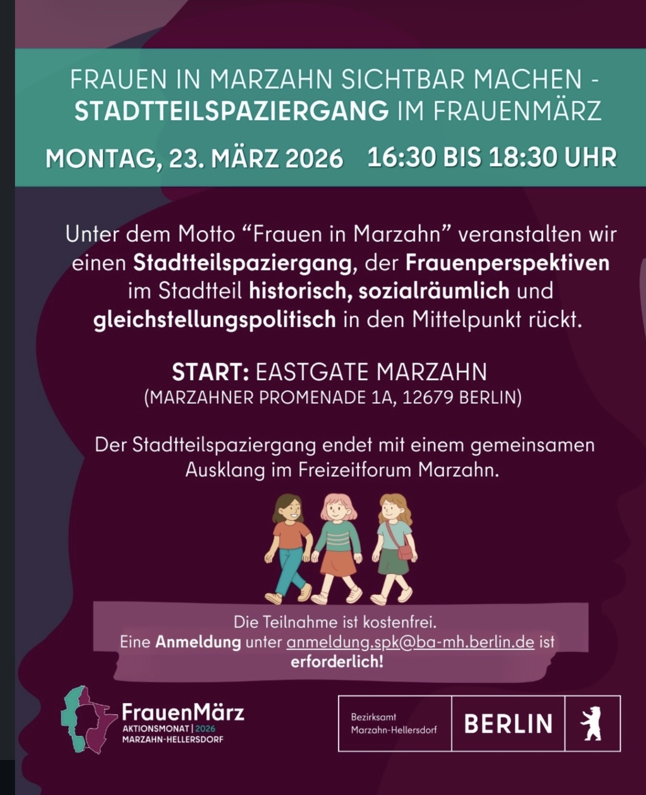 22.03.26 Innerhalb des FrauenMärz 2026 in Marzahn-Hellersdorf lädt das Bezirksamt am 23. März zum Stadtspaziergang „Frauen in Marzahn“ ein. Start 16.30 Uhr am Eastgate.