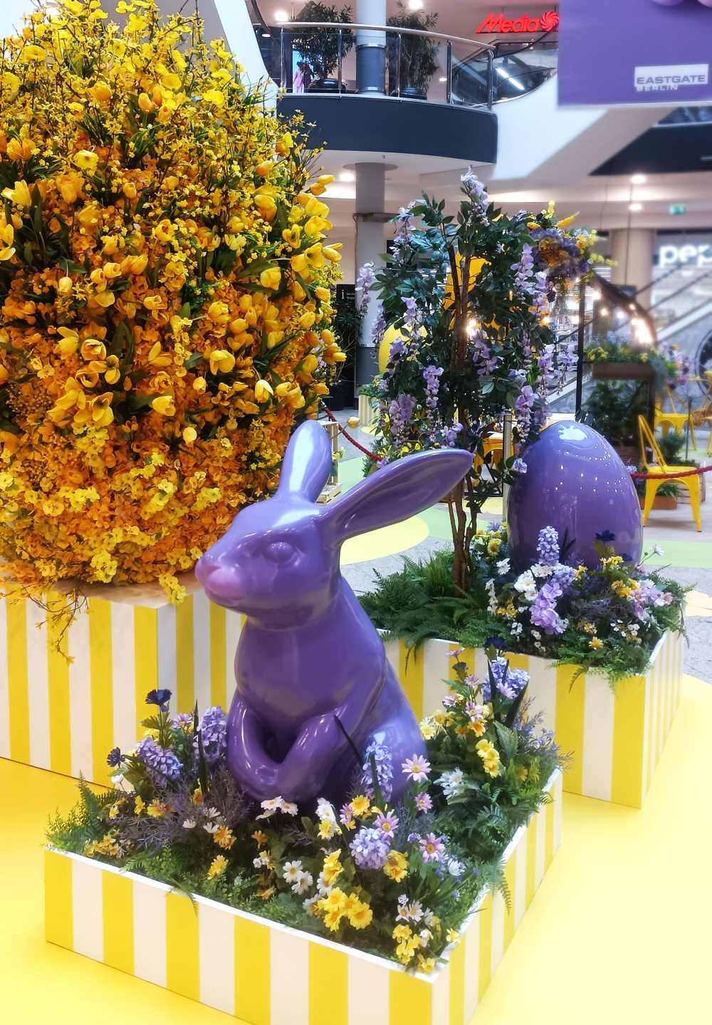 01.04.26 Herzlich willkommen zum Ostershopping! Noch bis zum 6. April ist das EASTGATE in eine kunterbunte Osterwelt verwandelt. Zwischen XXL-Blumen und überdimensionalen Ostereiern können die Kunden flanieren und sich von tierischen Maskottchen in Frühlingsstimmung versetzen lassen.
