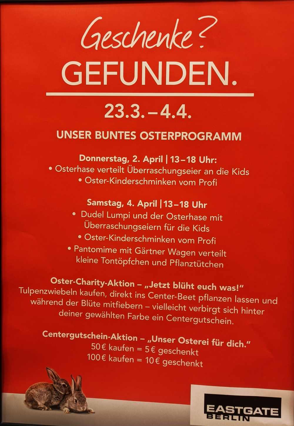 Neben einer entspannten Suche nach den passenden Ostergeschenken für eure Liebsten erwartet euch ein abwechslungsreiches Programm für die ganze Familie.