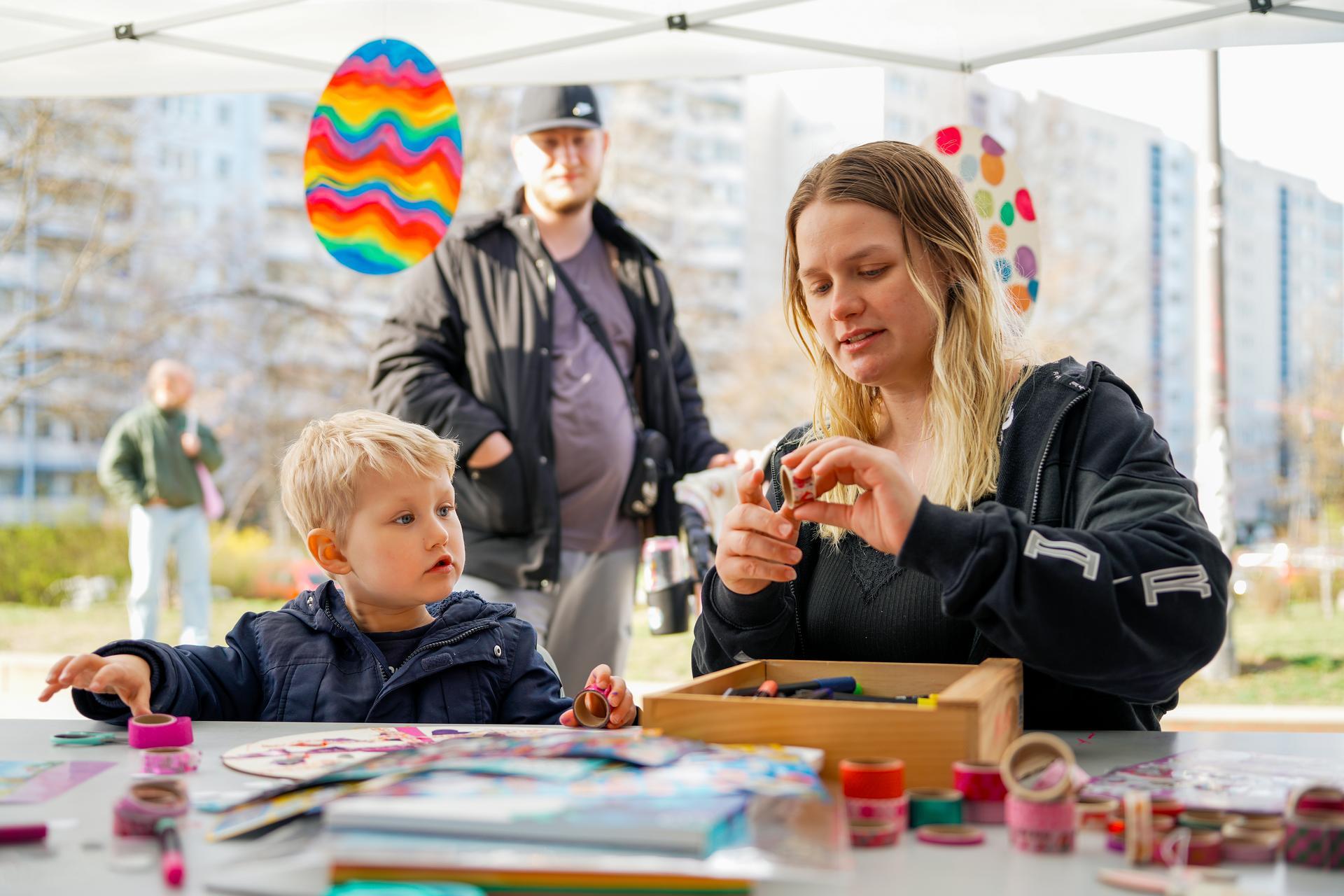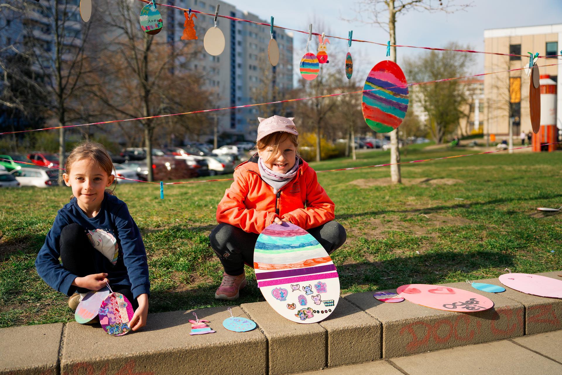 Bebilderter Rückblick auf die Osteraktion vor der Galerie M, unterstützt von degewo und durchgeführt von den Mitgliedern der Neuen KunstInitiative Marzahn-Hellersdorf.