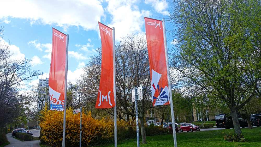 10.04.26 Der Frühling macht alles wieder neu. Auch die orangenen Fahnen am Eingang zur Promande (Raoul-Wallernberg-Straße) flattern jetzt wieder heil und schön im Frühlingswind. Der Winter hatte die Alten etwas zerschlissen. (Wir berichteten)