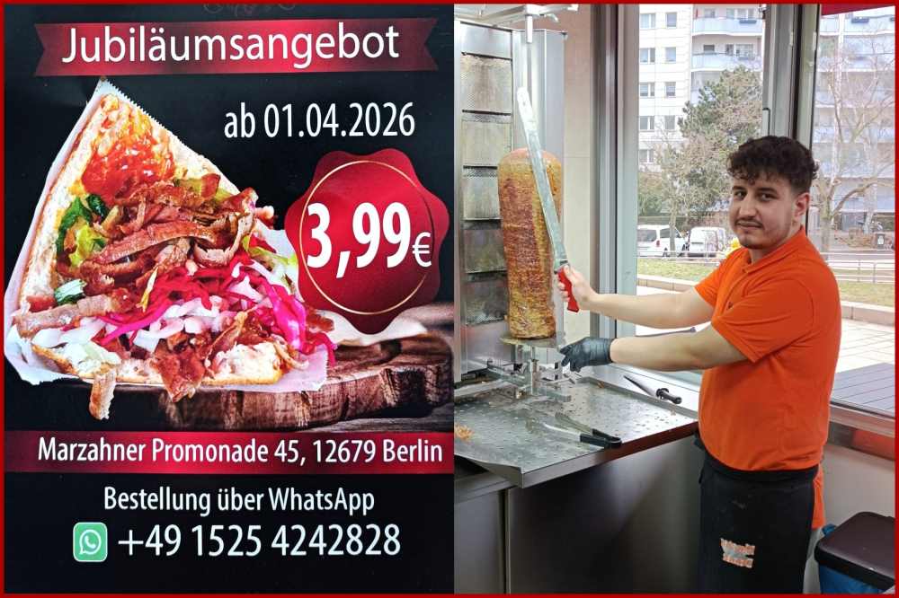 27.03.26 Nein, kein Aprilscherz, obwohl das Jubiläumangebot Döner für 3,99 Euro an genau diesem Scherztag beginnt. Der Inhaber von "Myster Döner" versichert sogar, das bleibt auch eine ganze Weile so, mindesten ein halbes Jahr.