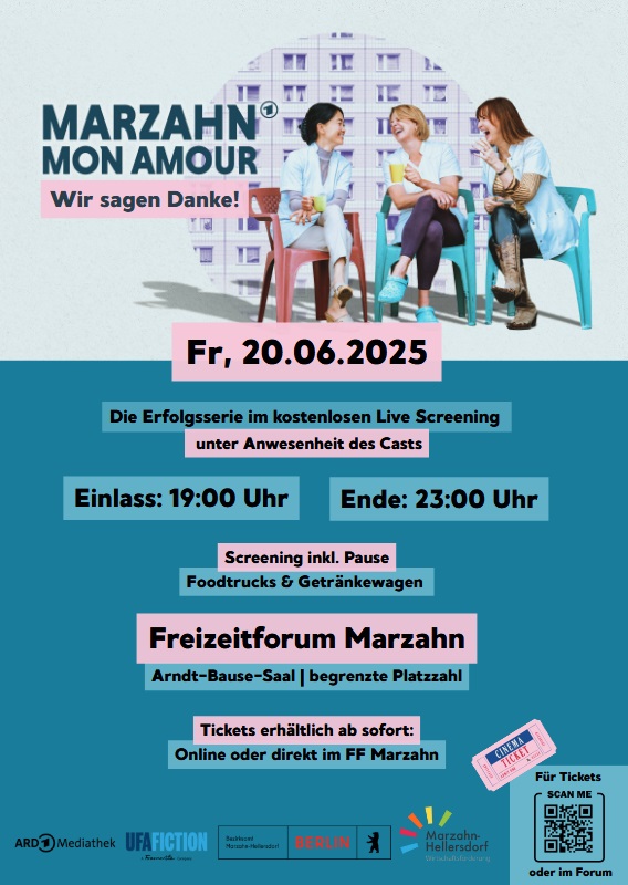 Ursprüngliche war die Vorführung als Open-Air-Kino auf dem Victor-Klemperer-Platz vorgesehen. Doch auf jeden Fall ist auch die Vorführung von Marzahn Mon Amour im Arndt-Bause-Saal kostenlos. Tickets gibt es an unserer Theaterkasse und im FFM-Online-Shop.