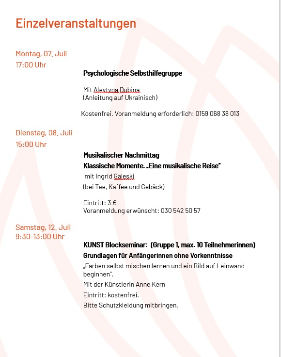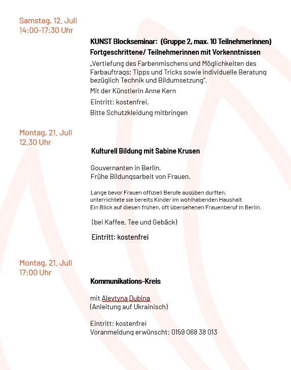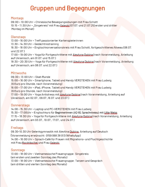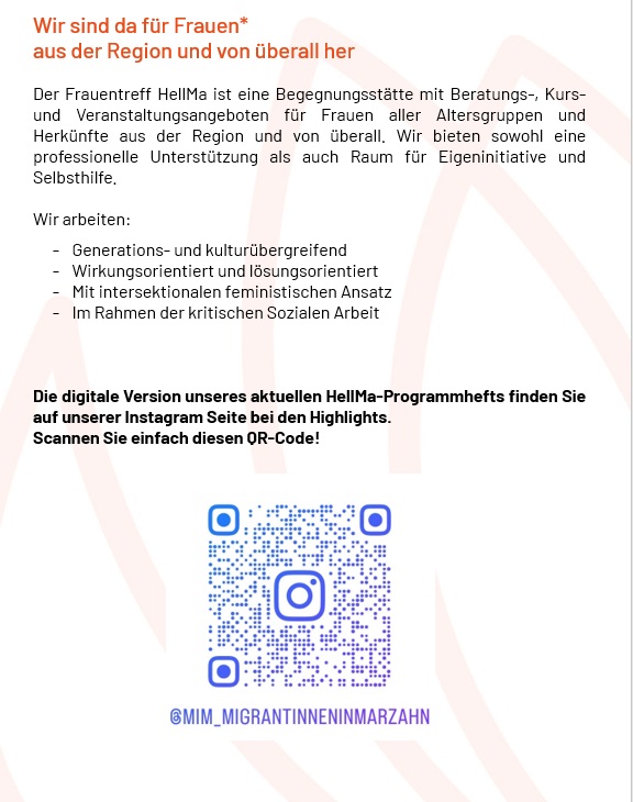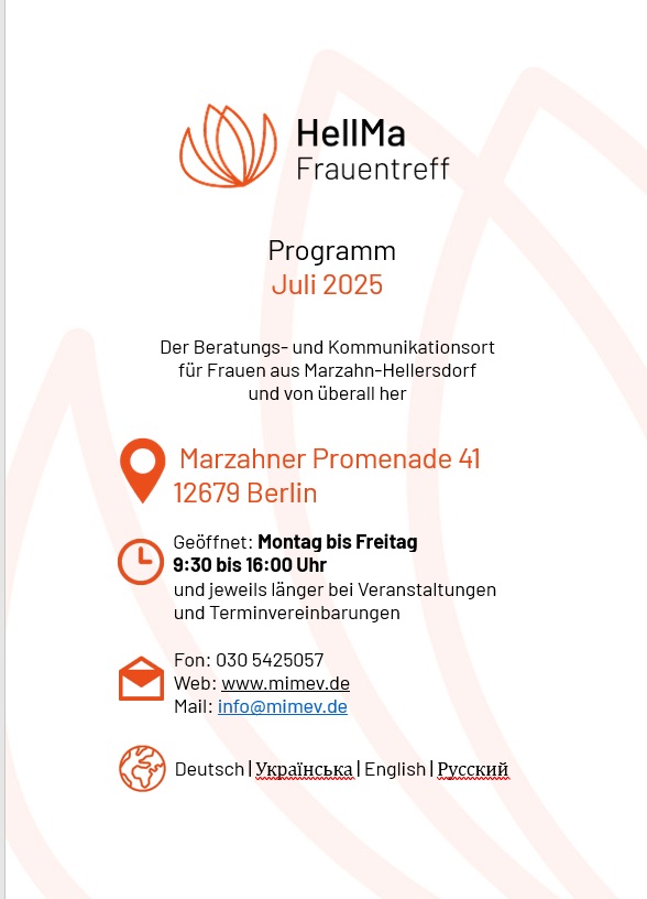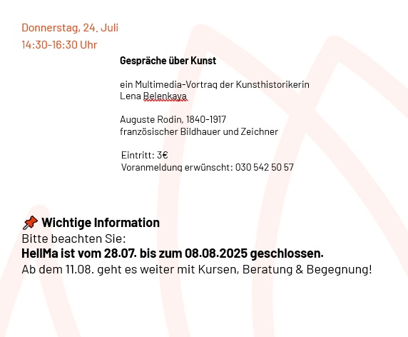 29.06.25 HellMa ist vom 28.07. bis zum 08.08.2025 geschlossen. Ab dem 11.08. geht es weiter mit Kursen, Beratung & Begegnung! Zuvor ist aber auch noch ein umfangreiches Programm im Angebot.