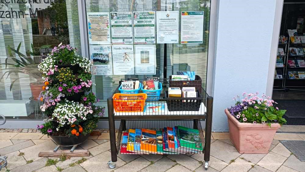 Bücherstand zum Mitnehmen und Hinlegen vor dem Stadtteilzentrum. Gute Idee!
