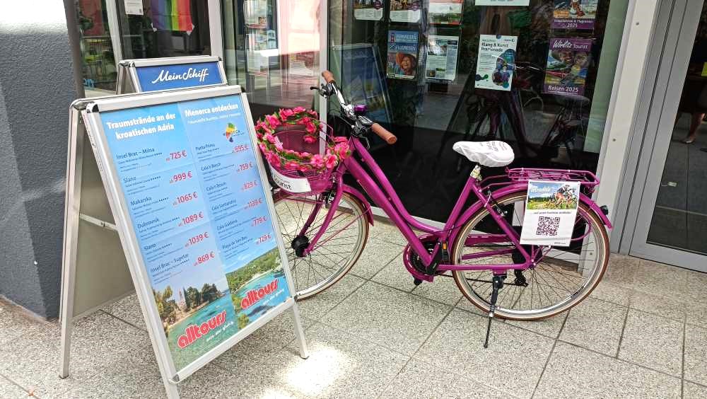 Meistens bucht man im Reisebüro keine Fahrradtour. Aber das Rad vor der Tür ist sehr hübsch gestaltet und macht Freude, es zu sehen. Vielleicht regt es zum Reisen an, ob mit dem Rad in die Umgebung oder dem Flugzeug in weite Fernen.