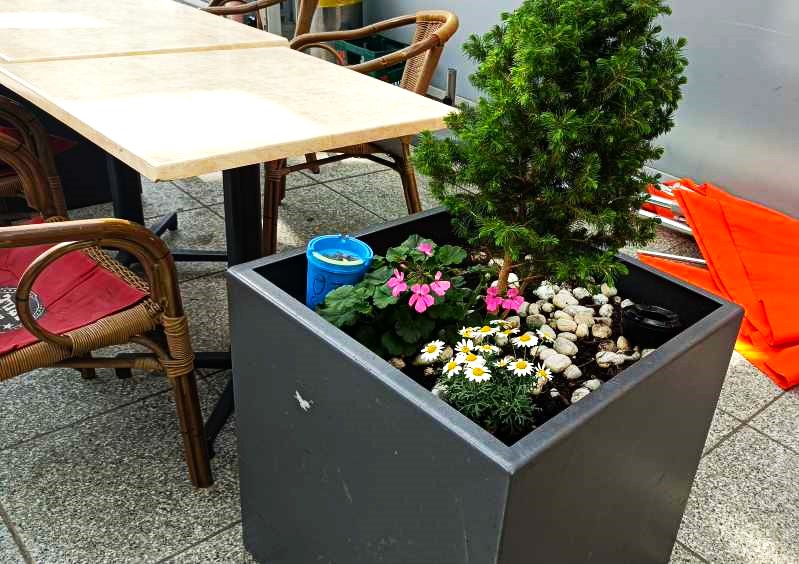 Schöne Arrangements vor der MachBar37. Kleines Gebet: "Hoffentlich reißt das nicht wieder jemand raus!"