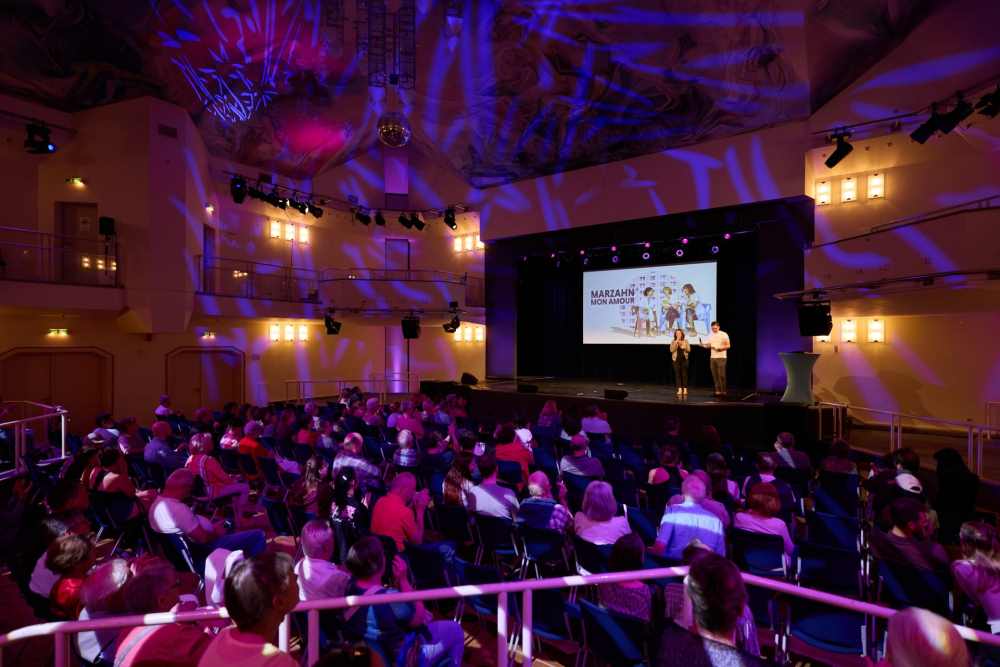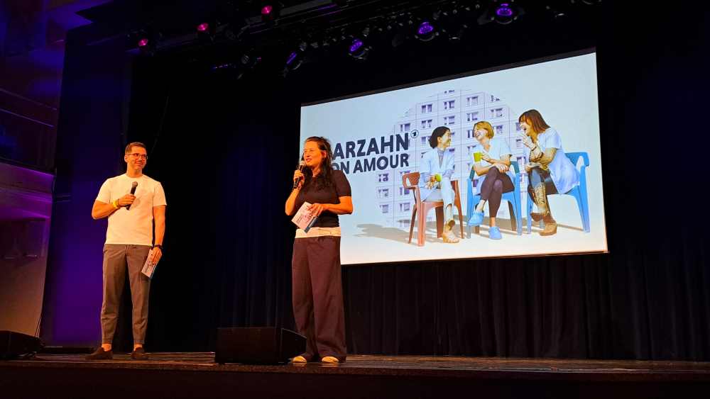 01.07.25 Bezirksbürgermeisterin Nadja Zivkovic hatte die Idee, die ARD-Degeto-Serie „Marzahn, mon amour“ als kostenlose Veranstaltung im Freizeitforum anzubieten. Auf dem Foto mit Sebastian Haas (UFA Fiction). Foto: Kathrin Rüdiger