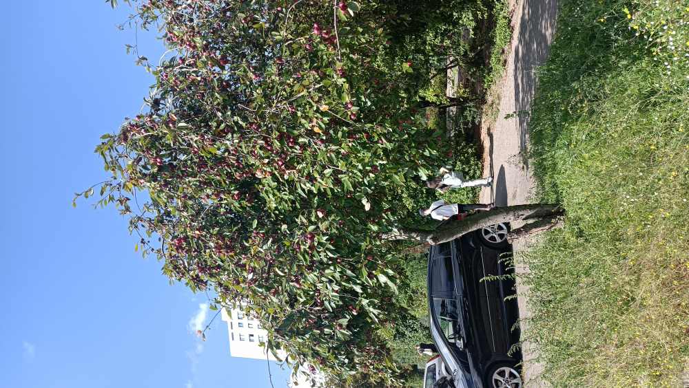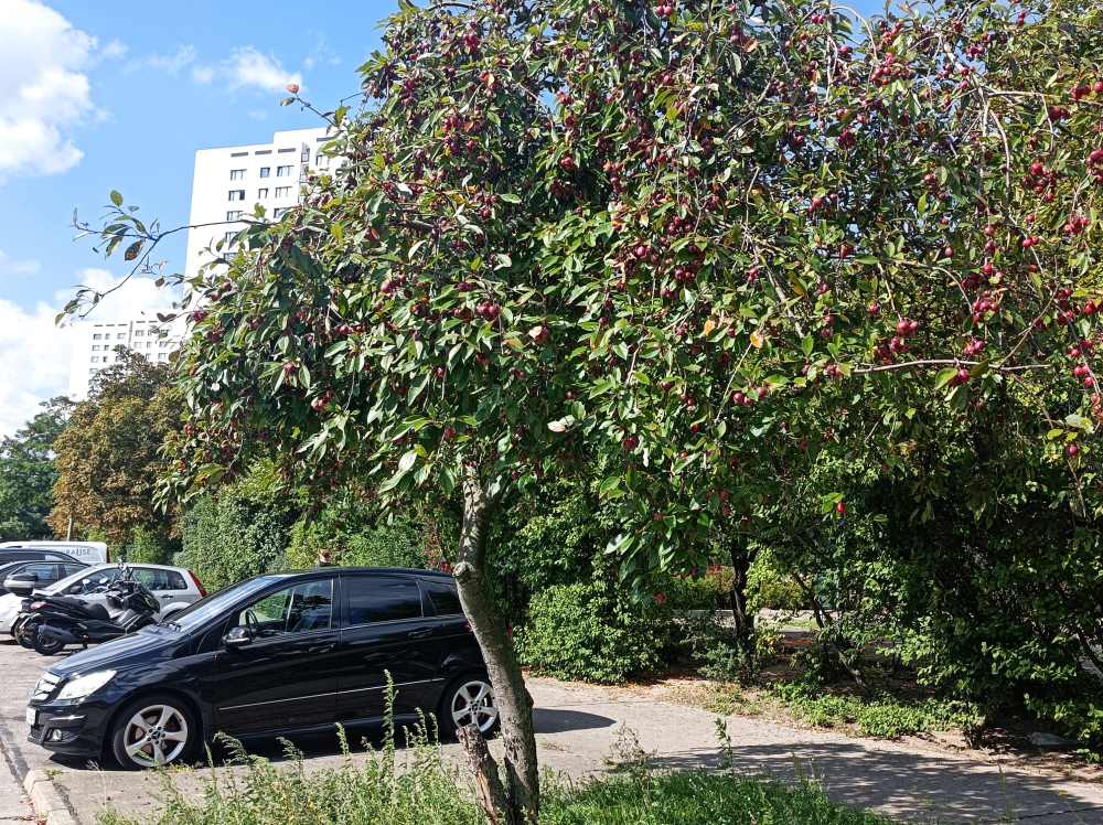 23.09.25 Nicht alle Früchte, die an Bäumen an der Promenadenstraße wachsen, sollte man essen, aber man kann. Dazu gehört auch der Toringo-Apfel.