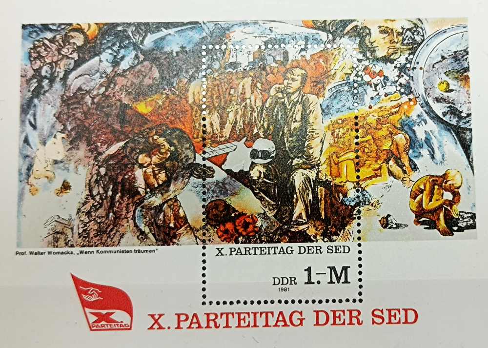 Neben Bildern an der Wand sind auch andere Werke von Walter Womacka im Stadtteilzentrum zu sehen. Unter anderem DDR-Briefmarken zu besonderen Anlässen, wie zum Beispiel zum 10. Parteitag der SED 1981 mit dem Titel: "Wenn Kommunisten träumen"..
