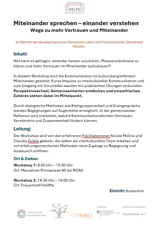 05.10.25 Wie kann es gelingen, einander besser zuzuhören, Missverständnisse zu klären und mehr Vertrauen im Miteinander aufzubauen? Am 6. Oktober gibt es dazu einen Workshop im Frauentreff Hellma, worin es darum geht, die Kommunikation im kulturübergreifenden Miteinander zu stärken. Das ganze Hellma-Oktober-Programm: