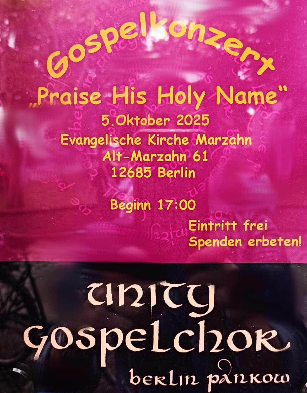 04.10.25 Die evangelische Kirche in Alt Marzahn lädt ein zu einem Gospelkonzert "Prise His Holy Name" in der Kirche am 5. Oktober um 17 Uhr.