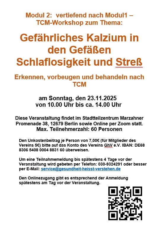 06.11.25 Für Gesundheitsbewusste gibt es im November wieder spannende Vorträge über die vielfältigen Möglichkeiten der Traditionellen Chinesischen Medizin. Dazu lädt der Verein "Gesundheit heißt Verstehen e.V." ins Stadtteilzentrum, MP 38, ein.