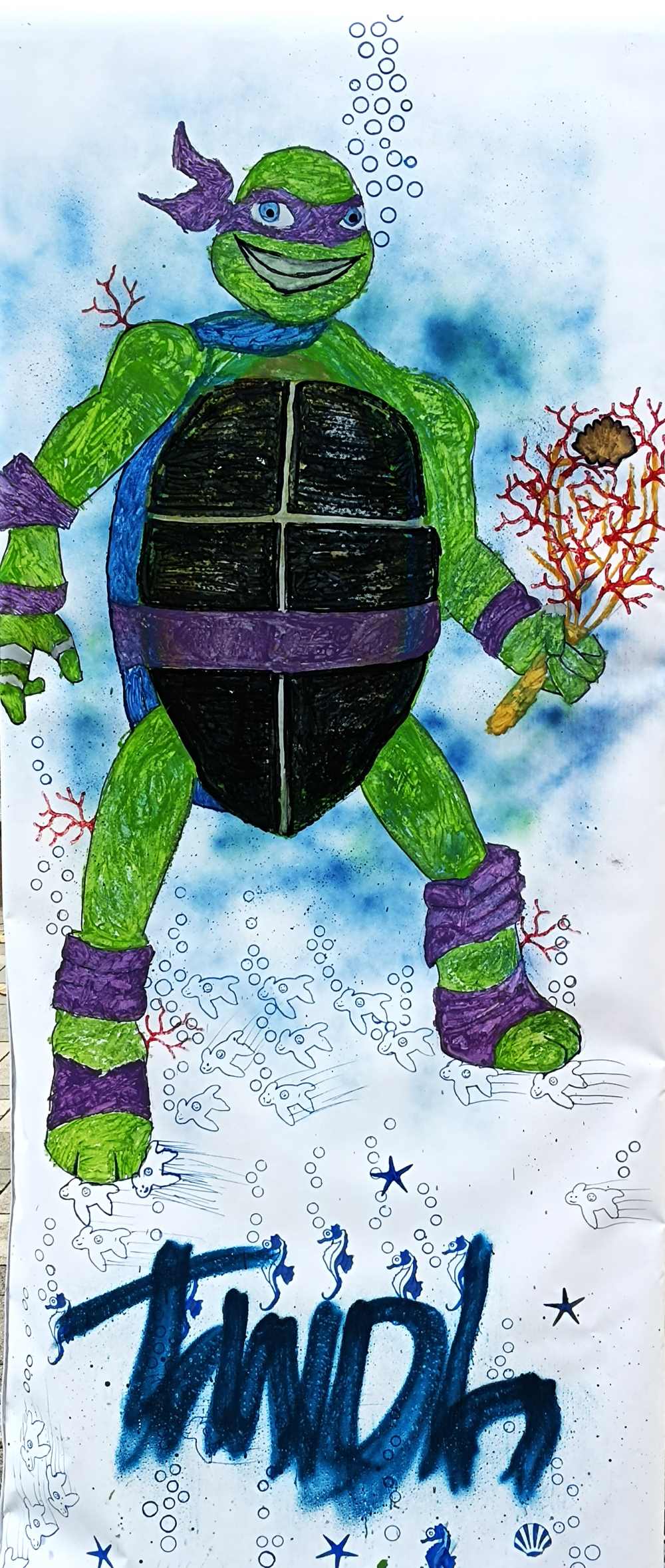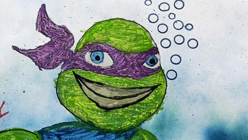 Der grüne Turtel - zu deutsch Schildkröte - auf der Vorderseite ist eine beliebte Figur aus Kinderfilmen. Turtels kämpfen stets für Gerechtigkeit und das Gute in der Welt - wenn es sein muss, auch mit Waffen.