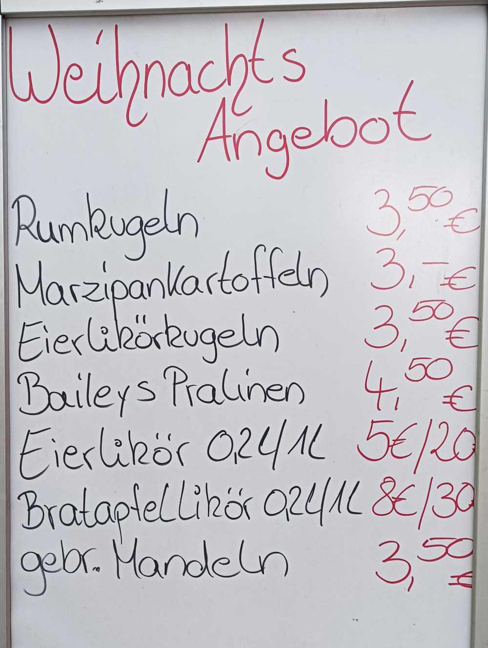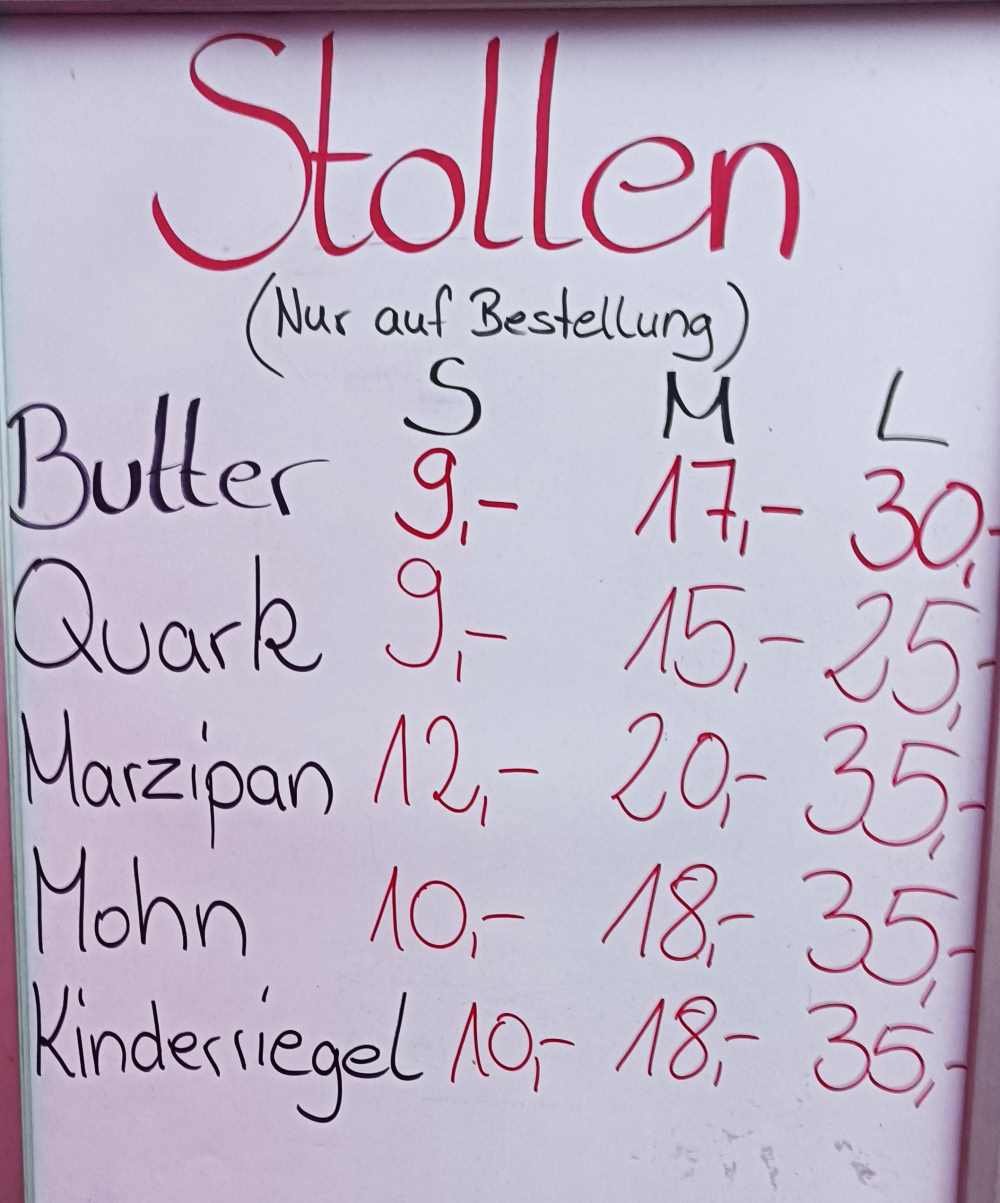 Während Rumkugeln und Marzipankartoffeln, Bratapfellikör und gebrannte Mandeln zum Mitnehmen schon da sind, sollten leckere Stollen für die Weihnachts-Kaffee-Zeit vorbestellt werden.