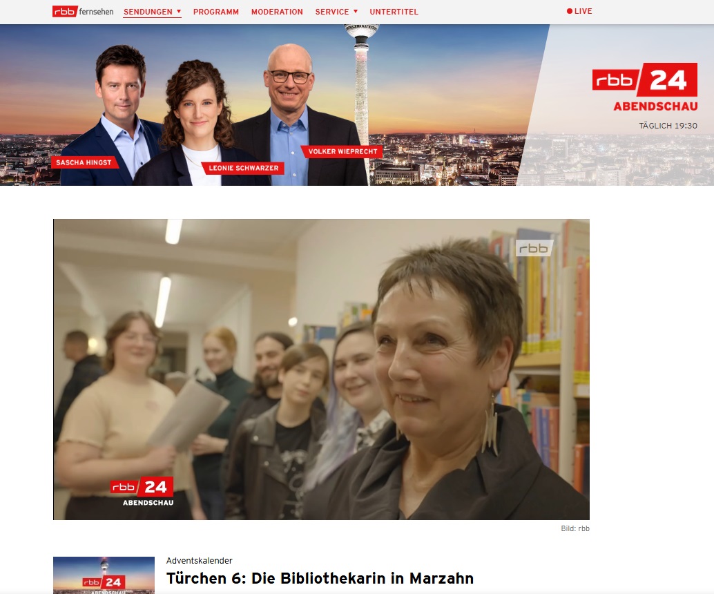 Unser Abendschau-Adventskalender – das sind Lieblingsberlinerinnen und -berliner, die Sie als Zuschauer vorschlagen konnten – aber auch aus der Redaktion kamen Ideen. Arndt Breitfeld meinte zum Beispiel: Mensch, ich hatte vor ein paar Monaten eine so tolle Begegnung in Marzahn, die würde ich gerne vorstellen; eine Bibliothekarin, die schon ganz lange junge Schreib-Talente im Bezirk fördert.