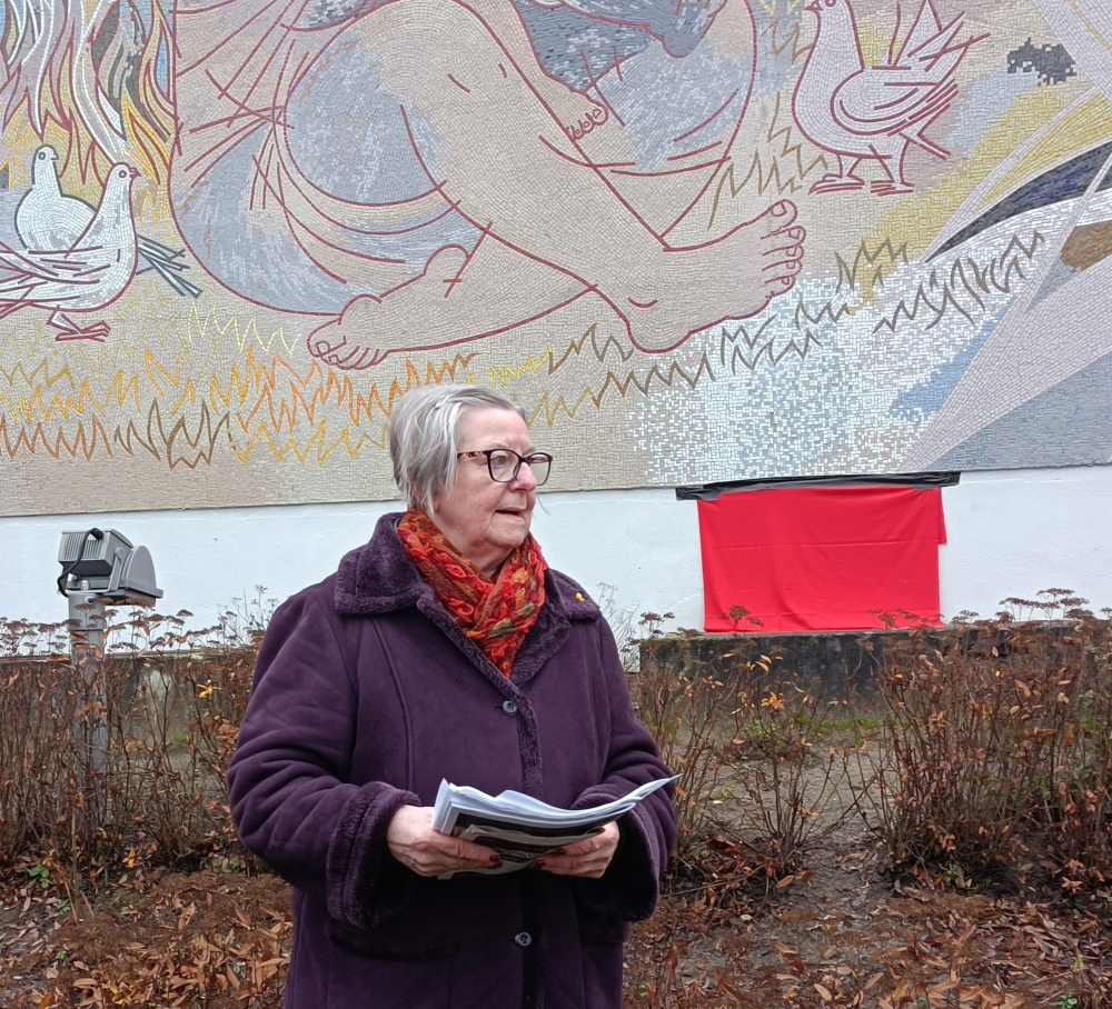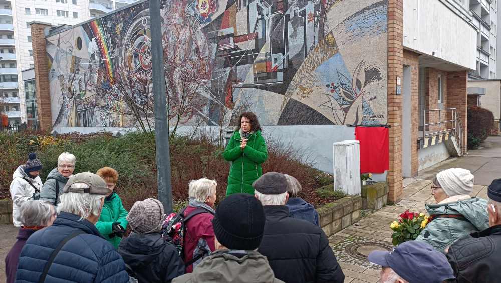 An diesem Dezembertag sollten die Erinnerungstafeln enthüllt werden. Dafür wurde in den vergangenen Wochen gesammelt und das Geld war zusammengekommen. Gemeinsam ging man zu den einzelnen großen Mosaiken "Arbeit und "Frieden", wo Martina Polizzi, Leiterin des Stadtteilzentrums, die Tafeln unter Beifall enthüllte.