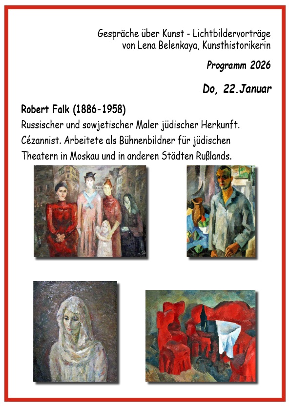 19.01.26 Am 22. Januar lädt Kunsthistorikerin Lena Balenkaya wieder zu ihren unterhaltsamen und interessanten Kunstgesprächen im Frauentreff HellMa ein. Dieses Mal geht es um den Maler Robert Falk (1886-1958).