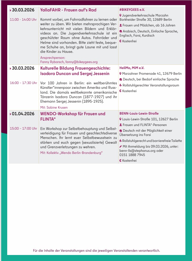 Zusätzlich thematisiert der Aktionsmonat spezifische Lebensrealitäten durch Beratungen der Polizei Berlin zu häuslicher Gewalt oder Infos der Suchtberatung. Kulturelle Beiträge würdigen Persönlichkeiten wie die Komponistin Clara Schumann oder die Tänzerin Isadora Duncan. Interkulturelle Feste zum Nouruz-Neujahr fördern den Austausch in der Nachbarschaft. Praktische Kurse wie Fahrrad-Trainings und Wendo-Workshops zur Selbstbehauptung stärken die Autonomie von Frauen und Mädchen.