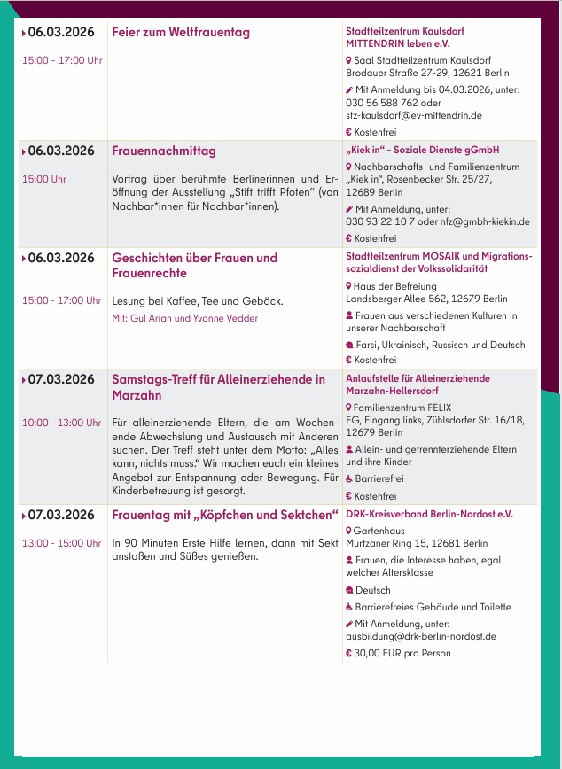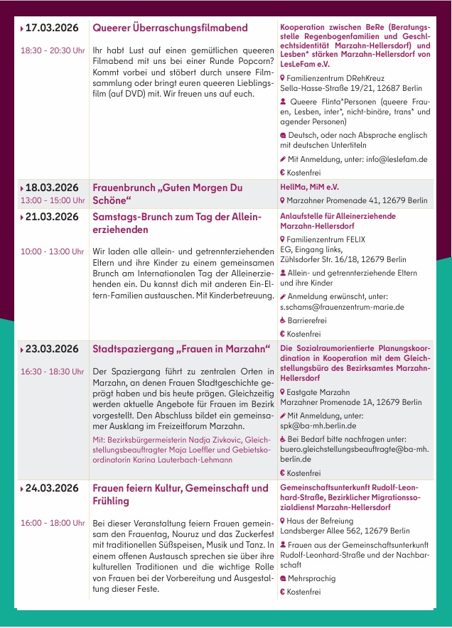 Am 2. März 2026 zeigt das Bezirksamt in Kooperation mit der Koordinierungsstelle für Demokratieentwicklung den Film „Ein Tag ohne Frauen“ im CineStar Hellersdorf. Eine Fachveranstaltung zum Thema „Mütter in die Kommunalpolitik“ findet am 13. März in der Studiobühne des Freizeitforums Marzahn statt, gefolgt von einer Party für FLINTA* (Frauen, Lesben, inter*, nicht-binäre, trans* und agender Personen). Am 23. März lädt das Bezirksamt zudem zum Stadtspaziergang „Frauen in Marzahn“ ein.