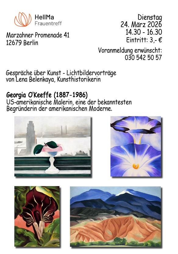20.03.26 In den "Gesprächen über Kunst" mit Kunsthistorikerin Lena Belenkaya geht es um Georgia O`Keeffe, Begründerin der amerikanischen Moderne, am 24. März um 14.30 Uhr im Frauentreff HellMa.
