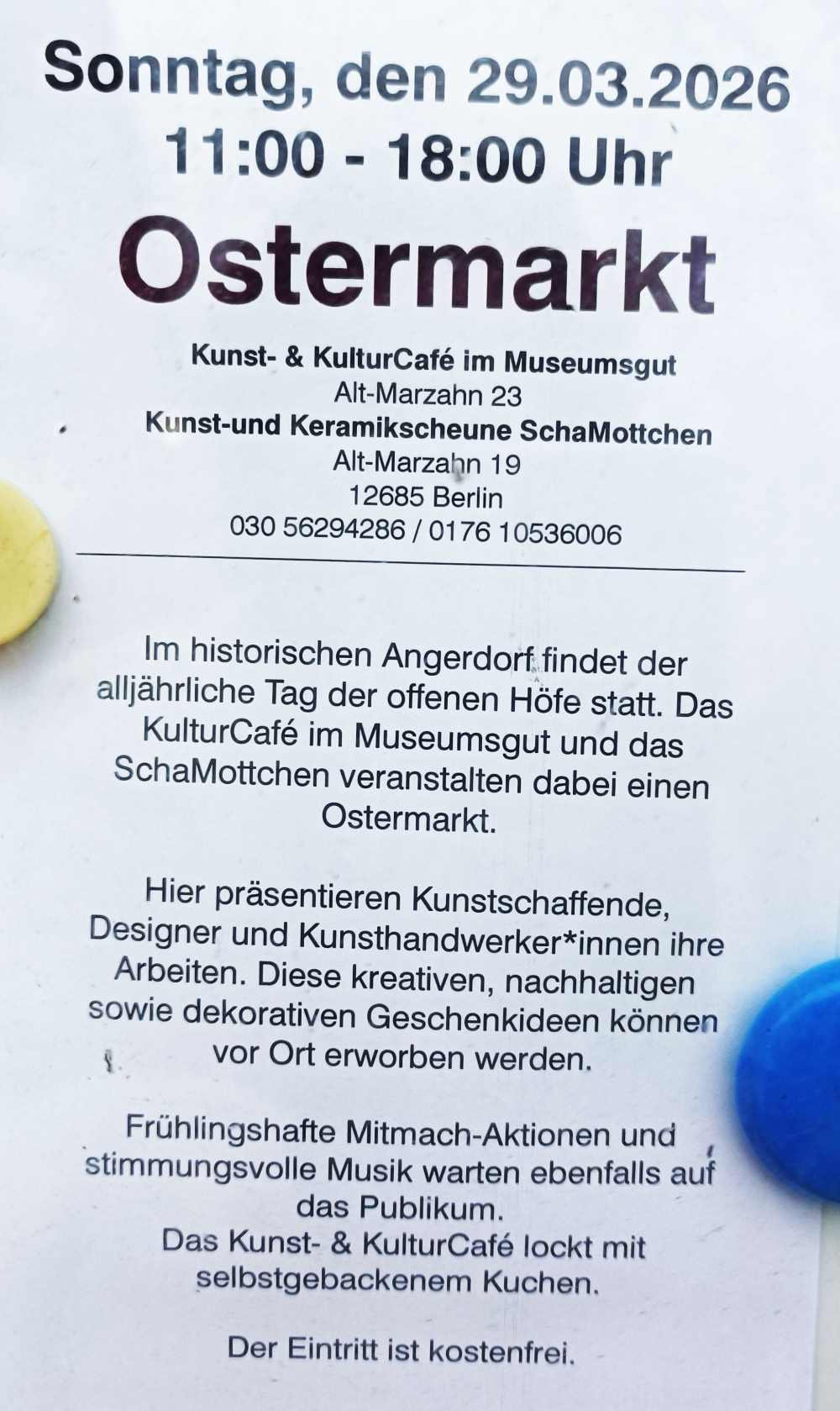 28.03.26 Der Ostermarkt und Tag der offenen Höfe in Alt-Marzahn findet am Sonntag, dem 29. März, statt. Besucher erwartet von 10 bis 18 Uhr ein kunsthandwerklicher Markt auf dem Gelände des KulturGut Alt-Marzahn mit Tierhof, Führungen auf dem Mühlenberg und verschiedenen Mitmachaktionen für Familien.