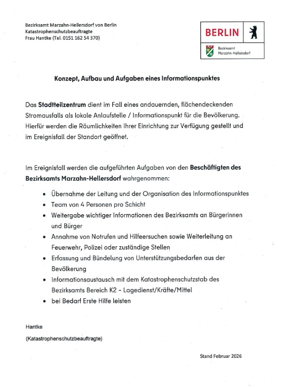 13.04.26 Der Stromausfall Anfang des Jahres im Südwesten Berlins mobilisierte auch den Katastrophenschutz im Bezirk Marzahn-Hellersdorf. So wurden unter anderem auch Anlaufstellen für die Bevölkerung eingerichtet, zum Beispiel ist das Stadtteilzentrum, MP 38, dafür vorgesehen.