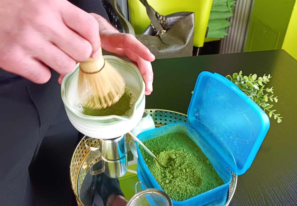 - Matcha sieben: Das Pulver wird durch ein feines Sieb gestrichen, um Klümpchen zu vermeiden.