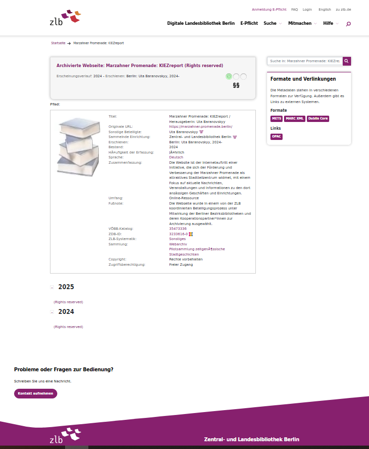 21.04.26 Seit 2024 wird der Internetauftritt Kiez-Report der Marzahner Promenade – www.marzahner-promenade.berlin - in der Digitalen Landesbibliothek Berlins als digital-kulturelles Erbe der Stadt Berlin archiviert und geführt: https://digital.zlb.de/viewer//toc/35473336/1/.