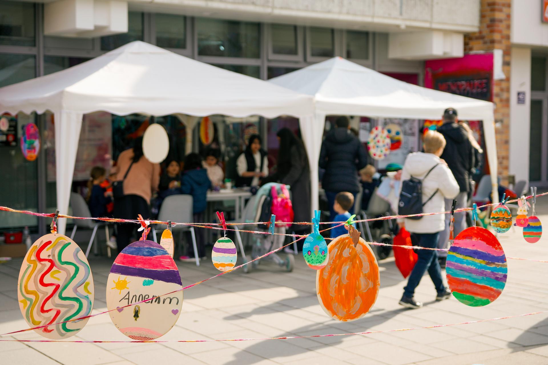 Bebilderter Rückblick auf die Osteraktion vor der Galerie M, unterstützt von degewo und durchgeführt von den Mitgliedern der Neuen KunstInitiative Marzahn-Hellersdorf.