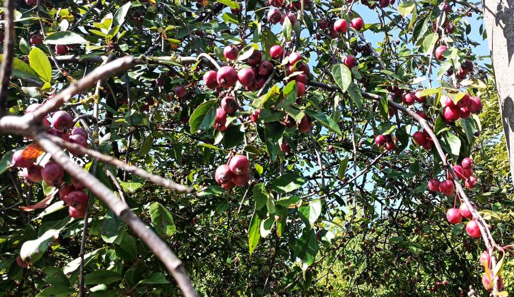 23.09.25 Nicht alle Früchte, die an Bäumen an der Promenadenstraße wachsen, sollte man essen, aber man kann. Dazu gehört auch der Toringo-Apfel.